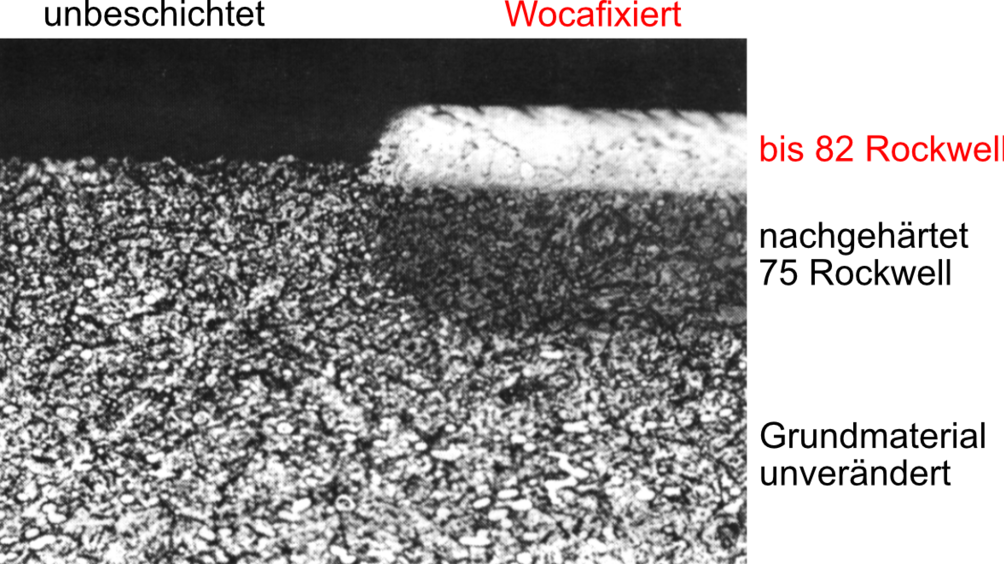 Der darunterliegende Stahl wird durch die Beschichtung nicht enthärtet, sondern nimmt in der oberen Zone an Härte zu. Bei bestimmten Stahllegierungen dringt die WolframKarbidschicht ins Grundmaterial ein.